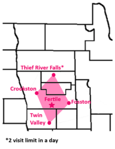 The service area of Paws Hoofs Claws is: Fertile (home hub), Crookston/Fisher (west hub), Thief River Falls/Newfolden (north hub), Bemidji (east hub), Twin Valley (south hub). Like postal workers, we’ll come in nice or horrible weather on smooth or nasty roads with a 4X Silverado and a Honda Civic to help. We’ll work in the surrounding areas from each hub. If you are outside of this main service area, you can definitely discuss your situation with Paws Hoofs Claws to determine the possibility of service to you. Sometimes, if the providers have room in their schedules, we could drive and work outside the service area with plenty of help with gas.